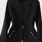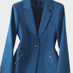 Impresiven sako z ženstvenim krojem, ki se izstopa po elegantnih podrobnostih. En gumb spredaj daje minimalistično eleganco, medtem ko dekorativni gumbi na žepih nudijo moderno noto. Idealno za poslovne sestanke, pa tudi za večerne izhode s stilom.
