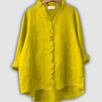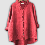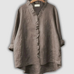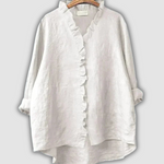 Elegantna lanena bluza, ki združuje preprostost in brezčasni stil. V-izrez s subtilnim volanom dodaja ženstven detajl, medtem ko sproščen kroj nudi udobje čez ves dan. Asimetričen rob z daljšim zadnjim delom predstavlja moden, a eleganten izbor za vsako priložnost.