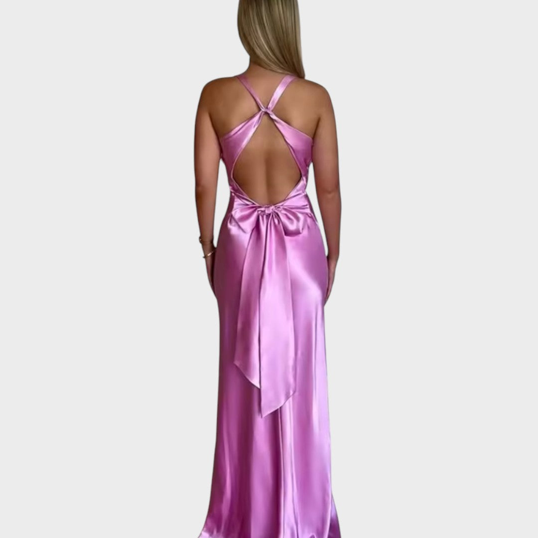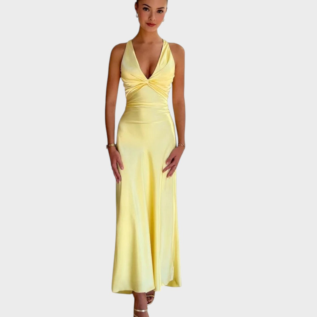 Poudarite svojo ženstvenost s to elegantno satensko obleko. Mehak material in izpopolnjen kroj nežno sledita liniji telesa, medtem ko dekolte v obliki črke V doda pridih glamurja. Popolna za posebne priložnosti ali poletne večere.