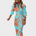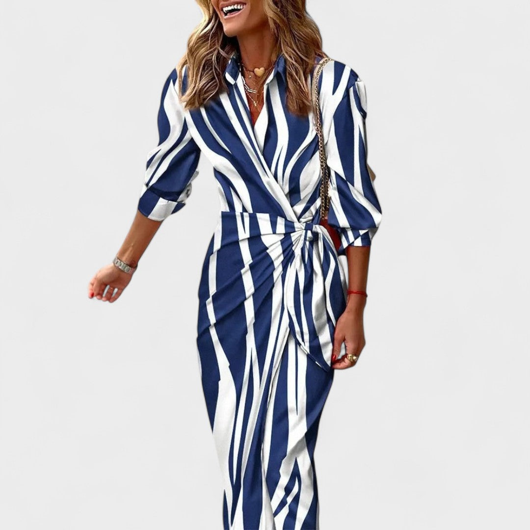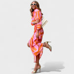 Obleka s srajčnim krojem, elegantnim ovratnikom in gumbi, lahka in prijetna tkanina, ki lepo pada, ter tekoča silhueta s prefinjenim razporkom – ta barvita dolga obleka je ustvarjena za takojšen učinek. Subtilno poudarja pas in omogoča svobodo gibanja, zato enako dobro deluje v dnevnih kombinacijah in večernih priložnostih.