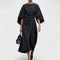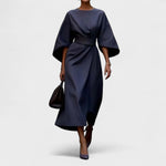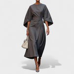 Rafinirana dolga obleka z ladijskim izrezom in voluminoznimi rokavi gradi prefinjeno, arhitekturno silhueto. Širok pas poudarja pas, medtem ko razkošno padajoča krila omogočajo svobodo gibanja in graciozen korak. Minimalistični detajli in čiste linije jo naredijo za popolno izbiro za svečane priložnosti, poslovne dogodke in večerne izhode.