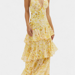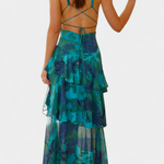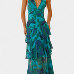 Lahka, romantična in z eleganco, ki se giba s tabo. Obleka Valentina združuje globok V-izrez z lepršavimi plastmi chifona, ki nežno ovijajo silhueto. Njeni toni, navdihnjeni z dragimi kamni, dodajajo pridih sproščene sofisticiranosti, idealne za poletje.