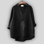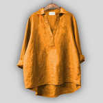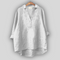 Elegantna lanena bluza v beli barvi, ki izžareva svežino in brezčasni stil. Ima V-izrez z diskretnim zapenjanjem, dolge rokave, ki jih je mogoče zavihati, in asimetričen zaključek z daljšim zadnjim delom, kar zagotavlja udobje in lahkotnost gibanja. Idealna izbira za hladne poletne kombinacije ali eleganten sproščen videz.