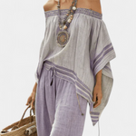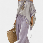 Bambusova bluzica s prugama, s otvorenimi rameni in širokimi hlačami za eleganten in svež stil