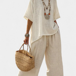 Celoten minimalistični Daisy v naravnih odtenkih z oversized majico in širokimi hlačami za preprost in eleganten stil