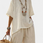 Čista preprostost z naravno eleganco. Set Daisy se izstopa s svojo sproščeno in monokromatsko silhueto, idealen za tiste, ki iščejo udobje in čist stil. Izdelan iz lahkega materiala, ta videz spremlja vsak gib s svežino in elegantno sproščenostjo.