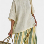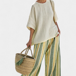 Naravno, sveže in z morskim občutkom. Daisy komplet v olivnih in svetlo rumenih odtenkih združuje široko majico iz bambusovega lanu z hlačami z navpičnimi črtami, kar ponuja sproščeno estetiko z elegantnim in svetlim pridihom.