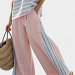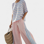 Sladkost in lahkotnost v vsakem koraku. Set Daisy v odtenkih roza in modre združuje top z valovitimi linijami in širokimi ter zračnimi hlačami, kar ustvarja svež in udoben videz, idealen za sončne dni ob morju.