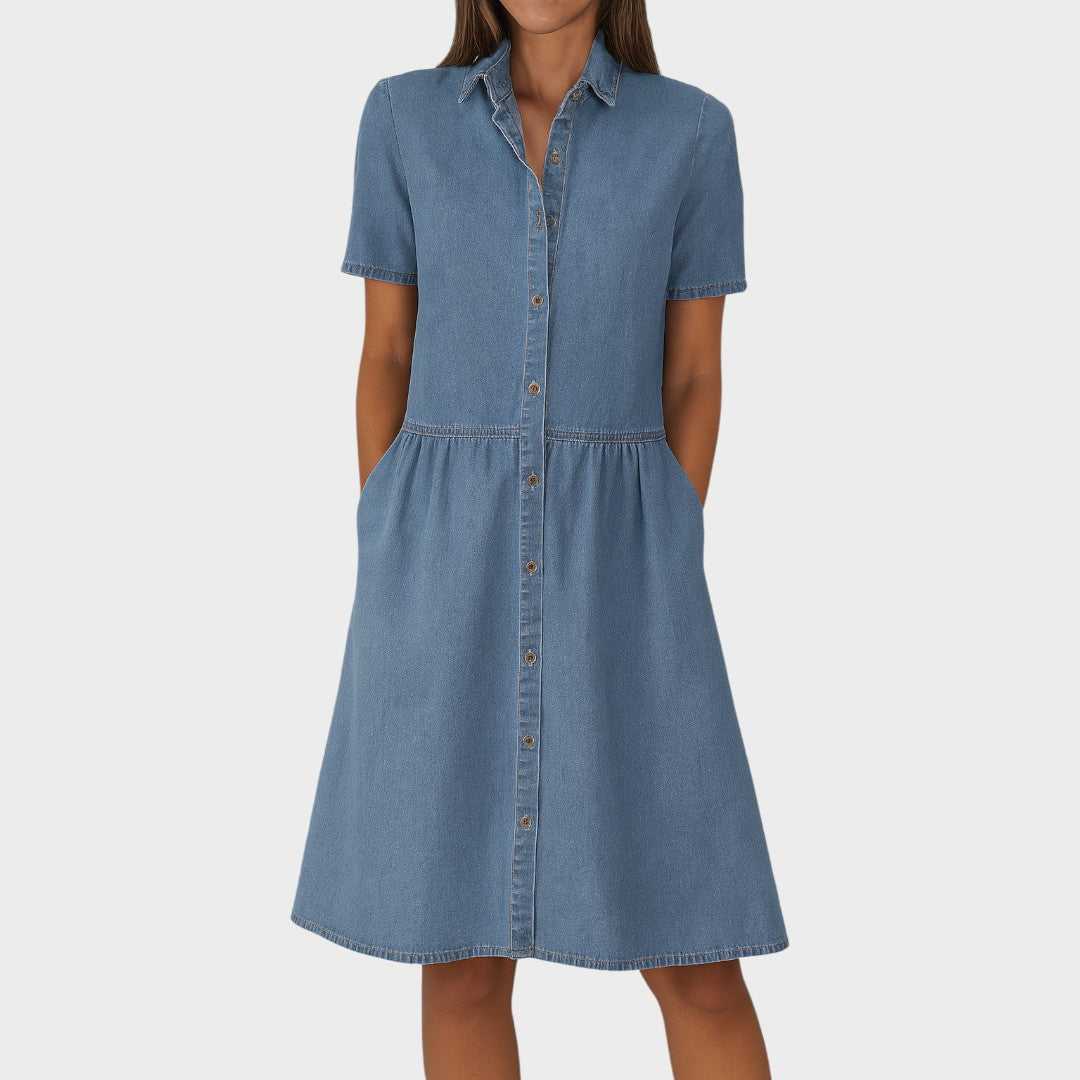 Ta košulja-haljina prinaša popolno kombinacijo praktičnosti in brezčasnega sloga. Zahvaljujoč klasičnemu kroju z gumbi po vsej dolžini in ovratniku, nudi urejen in moderen videz, medtem ko ležeren padec materiala zagotavlja udobje čez ves dan. Stranski žepi dodajajo funkcionalnost in ležerno noto, kar jo dela idealno za vsakodnevne kombinacije.
