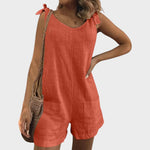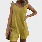 Ta lahki kombinezon je popolna izbira za tople dni in sproščene priložnosti. S sodobnim krojem brez rokavov, praktičnimi žepi in ženstvenim vezanjem na ramenih prinaša združitev udobja in stila, ki vas bo spremljala od jutra do večera.