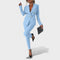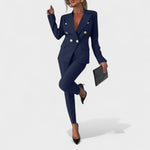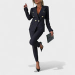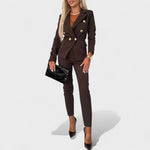 Sofisticiran komplet, ustvarjen za ženske, ki želijo izgledati profesionalno in samozavestno. Dvoredni sako z dekorativnimi gumbi oblikuje pas in daje popolno strukturo, medtem ko ozke hlače cigareta kroja, dolžine do gležnja, vizualno podaljšujejo silhueto. Udobna tkanina z blagim raztezanjem sledi gibanju in ohranja brezhiben videz od jutra do večera. Džepki s preklopom in čist kroj ga naredijo idealnega za pisarno, sestanke in svečane priložnosti — nosite ga kot komplet ali ločeno.