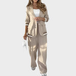 Sofisticirano, a sproščeno: ta 2-delni komplet združuje strukturiran sako z enorednim zapenjanjem in rokavi do polovice podlakti ter sproščene, široke hlače. Kontrastne športne črte na rokavih in hlačah dajejo sodoben "athleisure" pridih, medtem ko praktični žepi in prijetna, rahlo raztegljiva tkanina zagotavljajo udobje ves dan. Izgleda enako močno z supergami kot tudi s petami — od pisarne do vikend kave.