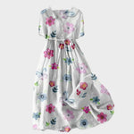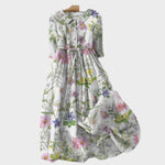 Dolga obleka s kratkimi rokavi združuje sproščen značaj srajce z romantičnim volumnom krila. Ovratnik z nežnim robom in vrsta gumbov dajejo prefinjen videz, medtem ko vezica v pasu enostavno prilagaja prileganje. Nabran kroj ustvarja fluiden padec, ki lepo sledi vsakemu koraku. Izdelana je iz lahkega, zračnega materiala, prijetnega na koži, zato je idealna za sprehode po mestu, izlete in vse sproščene priložnosti.