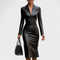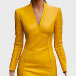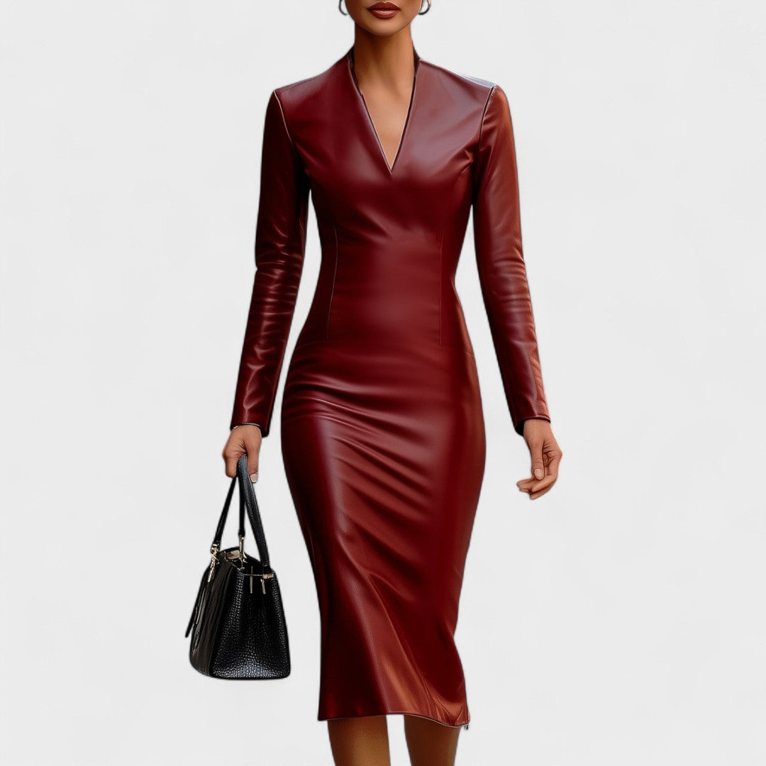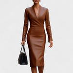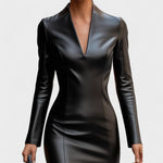 Ta uska obleka iz umetnega usnja je popolna izbira za ženske, ki želijo poudariti svojo samozavest in sofisticiranost. Sodobna kroja, ki sledi liniji telesa, izpostavlja postavo, medtem ko visok sijaj materiala daje drzno in luksuzno podobo. Idealna je za večerne izhode, posebne dogodke ali trenutke, ko želite pustiti močan vtis.