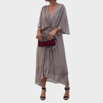 Ta elegantna čipkasta obleka je popolna kombinacija sofisticiranosti in ženskosti. S prozornimi rokavi in ​​lepršavim krojem zagotavlja odmerek glamurja, ne da bi pri tem ogrozila udobje. Globok V-izrez in detajli v pasu nežno poudarjajo postavo, kar to obleko naredi idealno izbiro za večerne izhode, slovesnosti ali posebne dogodke.