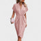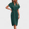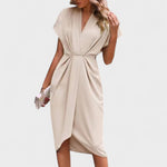 Elegantna midi obleka s prefinjenim V-izrezom, blagimi naborki v pasu in diskretnim razporkom, ki podaljšuje silhueto. Mehka, prijetna tkanina lepo pada in nudi udobje skozi ves dan, medtem ko čiste linije omogočajo enostavno stiliziranje – od poslovnih priložnosti do svečanih večerij.