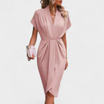 Prijazen kroj: poudarjen pas, V-izrez in midi dolžina vizualno podaljšujejo postavo.