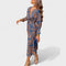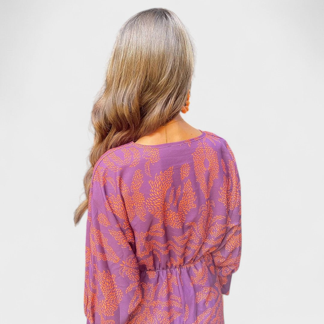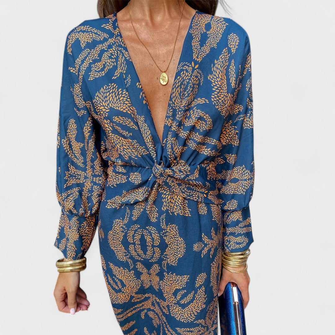 Ta obleka se izstopa s čudovitim vzorcem in ženstvenim krojem, ki poudarja pas. Dolgi rokavi in globok V-izrez ji dajejo sofisticiran videz, medtem ko lepršav material zagotavlja lahkotnost in udobje. Idealna je za dnevne svečanosti, romantične večerje ali poletne dogodke na prostem.
