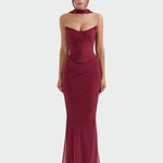 Elegantna in opazna obleka brez naramnic s prilagojenim krojem, ki poudari silhueto. Drapirani detajli na dekolteju in vezanje v stilu korzeta v pasu dodajajo ženskost in luksuz, medtem ko maxi dolžina nudi brezčasno sofisticiranost. Idealna za večerne izhode in svečane priložnosti.