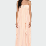 Elegantna maksimalna obleka s fluidnim gibanjem in ženstveno silhueto, ki nežno ovija telo. Izrazit dekolte in tanke naramnice poudarjajo vrat in ramena, medtem ko pas nudi eleganten videz. Idealna za poroke, krst in vsako posebno priložnost.