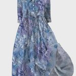 Ta dolga obleka v odtenkih sivke in modre združuje romantiko in eleganco. Njen poseben cvetlični vzorec s cvetjem dodaja pridih svežine, medtem ko jo lahka silhueta naredi idealno za pomladne in poletne priložnosti.