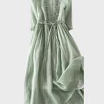 To preprosto in elegantno dolgo oblačilo v nežni zeleni odtenku izžareva svežino in naravno eleganco. Z lahkotno silhueto in sproščenim krojem nežno ovija telo ter nudi edinstveno udobje v vsakem trenutku dneva.