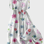 Ta prikupna maxi haljina izžareva pomladno in igrivo vzdušje, z belo podlago, ki se izstopa s pisanimi cvetličnimi vzorci in diskretnimi metulji. Njen udoben kroj in lahka tekstura jo naredijo idealno za vsakodnevne izhode in sproščene sprehode.