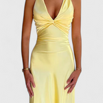 Izpopolnjena, moderna in s vizualnim učinkom, obleka Lea dvigne vaš stil s dizajnom, ki objema postavo in poudari vašo prisotnost. Njen globok V-izrez, zavit pas in mehko drapiranje jo naredijo sofisticirano izbiro za posebne dogodke in nepozabne noči.