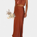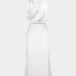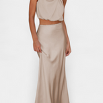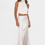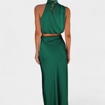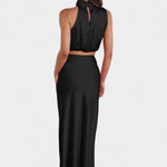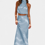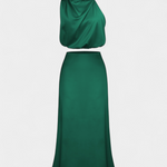 Živahna in opazna, ta kombinacija krila je zasnovana tako, da izstopa s svojim drapiranim topom s halter izrezom, nežnimi detajli in silhueto, ki elegantno teče. Nudi lahkoten in sofisticiran občutek, ki se čudovito giblje s tabo.