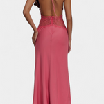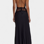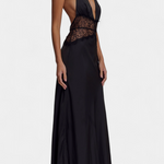 Oblikovanje, ki izžareva rafinirano senzualnost in sofisticirano eleganco. Martina združuje globok halter izrez z nežno čipkastno trakico na pasu, kar ustvarja popoln kontrast med subtilnim in drznim. Fluidna tkanina objame telo z gracioznostjo, medtem ko popolnoma odkrito hrbet doda nepričakovan in drzen preobrat.