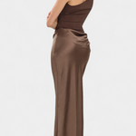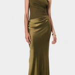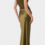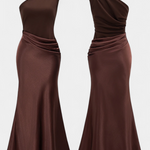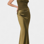 Zasnovana za izpostavljanje s večno eleganco, ta dolga plisejska obleka združuje sofisticiranost in prisotnost v vsakem gibu. Njen asimetrični izrez na eno ramo prinaša moderno in rafinirano noto, medtem ko nežni naborki padajo z lahkoto, da oblikujejo impozantno in ženstveno silhueto. Videza, zasnovanega za trenutke, ki zahtevajo distinkcijo in samozavest.
