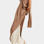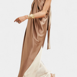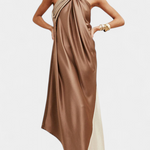 Z oblikovanjem, ki združuje senzualnost in modernost, obleka Petra izstopa s svojim halter izrezom in popolnoma odprtimi ledi. Njena fluidna silhueta, skupaj z igro blokov barv, ustvarja eleganten in avangarden vizualni vtis. Popolna za tiste, ki želijo zasvetiti s samozavestjo na katerem koli posebnem dogodku.