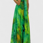 Lahkotni romantizem s silhueto, ki lebdi s vsakim korakom. Obleka Antonija je izdelana iz zračnega šifona z nežnim cvetnim motivom in elegantnim halter ovratom, ki subtilno poudari ramena. Njen sproščen in tekoč kroj nudi sproščeno padajočo obliko z eterealnim šarmom.