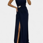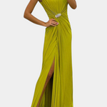 Brezhibna fuzija fluidnosti, elegance in scenske prisotnosti. Emilija izstopa s svojo izdelavo iz lahke tkanine, natančno oblikovanimi plisiranimi detajli in bočnim izrezom, ki spremlja vsak gib s gracioznostjo. Urezani izrez nežno oblikuje dekolte, medtem ko fluidna silhueta subtilno in sofisticirano podaljšuje postavo.