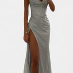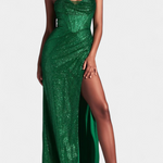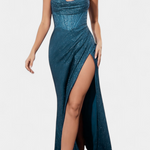 Drzna, dramatična in elegantna, haljina Ines je kos, zasnovan za sijaj v vsaki posebni priložnosti. Njena ozka morska silhueta, korzetni zgornji del in visok razporek na stegnu ustvarjajo opazen videz, ki poudarja sofisticiranost. Spageti naramenice in sijoč zaključek dopolnjujejo moderno in glamurozno estetiko.