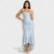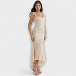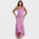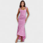 Ta čudovita dolga obleka v mehki vijolični barvi združuje eleganco in ženstvenost, z romantičnimi detajli in krojem, ki objema telo. Korset z drapiranim dizajnom poudarja pas, medtem ko asimetrična krila dodajajo gibanje in gracioznost vsakemu vašemu koraku.