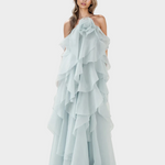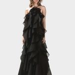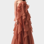 Ta čudovita dolga obleka v toplem rjavem odtenku izžareva luksuz in romantiko. Oblikovana z večplastnimi volani iz lahkega in zračnega materiala, ustvarja impresiven gib pri vsakem vašem koraku.