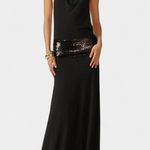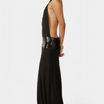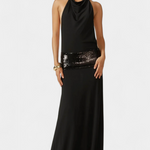 S subtilnim sijajem in očarljivo silhueto je obleka Ana ustvarjena, da izstopa na vsakem elegantnem dogodku. Njen drapiran halter izrez in popolnoma razkrita hrbtna stran nudita popoln ravnotežje med sofisticirano in senzualno, medtem ko trak iz bleščic dodaja pridih rafiniranega luksuza.