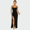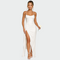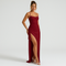 Ima tanke naramnice, prilagojen korzet in globok razporek ob strani, ki dodaja dinamiko in čar.