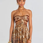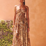 Impresivna maksi haljina z bogatim paisley vzorcem v odtenkih zlata, rjave in rdeče.