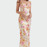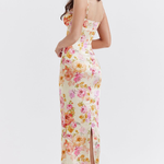 Impozantna maksi obleka s cvetličnim vzorcem, ki izžareva ženskost in eleganco. Njena ozka kroja poudarja silhueto, medtem ko dekolte s tankimi naramnicami nudi občutek subtilne privlačnosti. Kos, ki združuje romantiko in luksuz, idealen za posebne priložnosti.