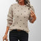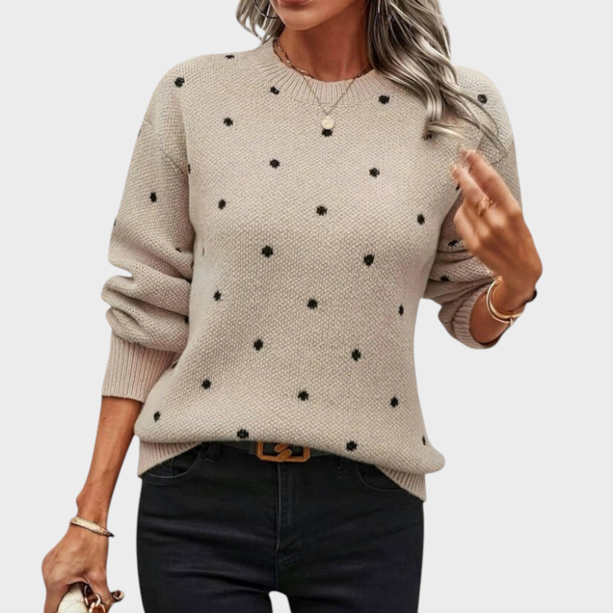 Ostanite stilizirano topli s Teodora pletenim puloverom s pikami, popolno kombinacijo udobja in šarma. Izdelan iz mehkega pletenega materiala, ta vsestranski kos ima brezčasni okrogli izrez in subtilen dizajn s pikami po celotni površini. Ne glede na to, ali ga nosite z džinsom za sproščen videz ob koncu tedna ali ga oblečete s krojenimi hlačami, je to nezaobilžen kos v garderobi.