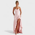 Dizajn z bočnim raskorakom in lepršavim volanom za elegantno gibanje