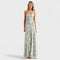 Ta dolga obleka združuje eterealno čarobnost cvetličnih vezov s naravno ožjo silhueto. Strukturni izrez in tanke naramnice jo naredijo za sofisticirano izbiro za posebne priložnosti, poroke ali nepozabne večere.